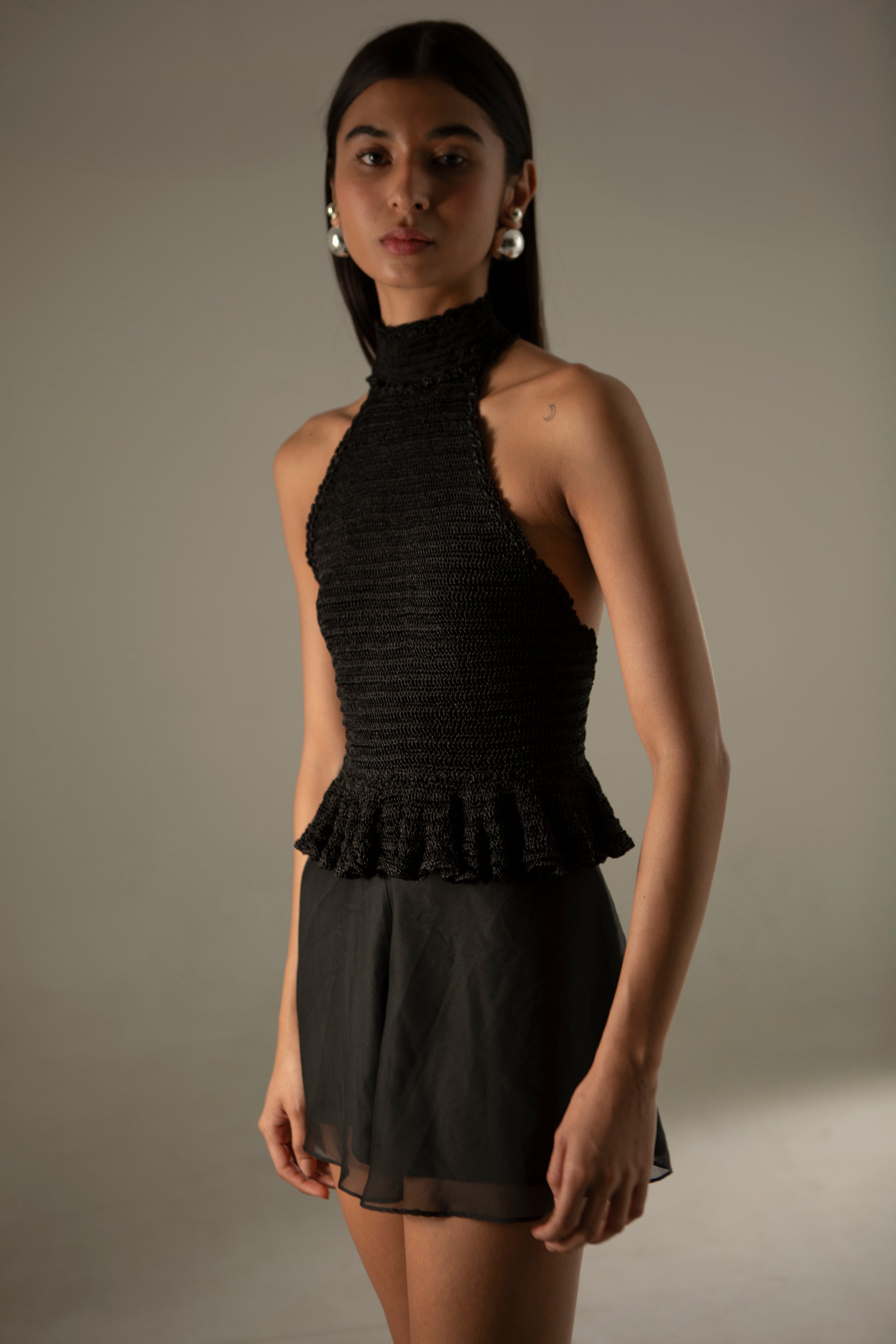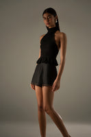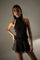 Hand-knit cropped top with a fitted halter silhouette. Features a structured high neckline and wide side slits, with an open back. It closes with a detachable woven drawstring with tassel details, adjustable to the back width. The neckline has a metal hook closure.