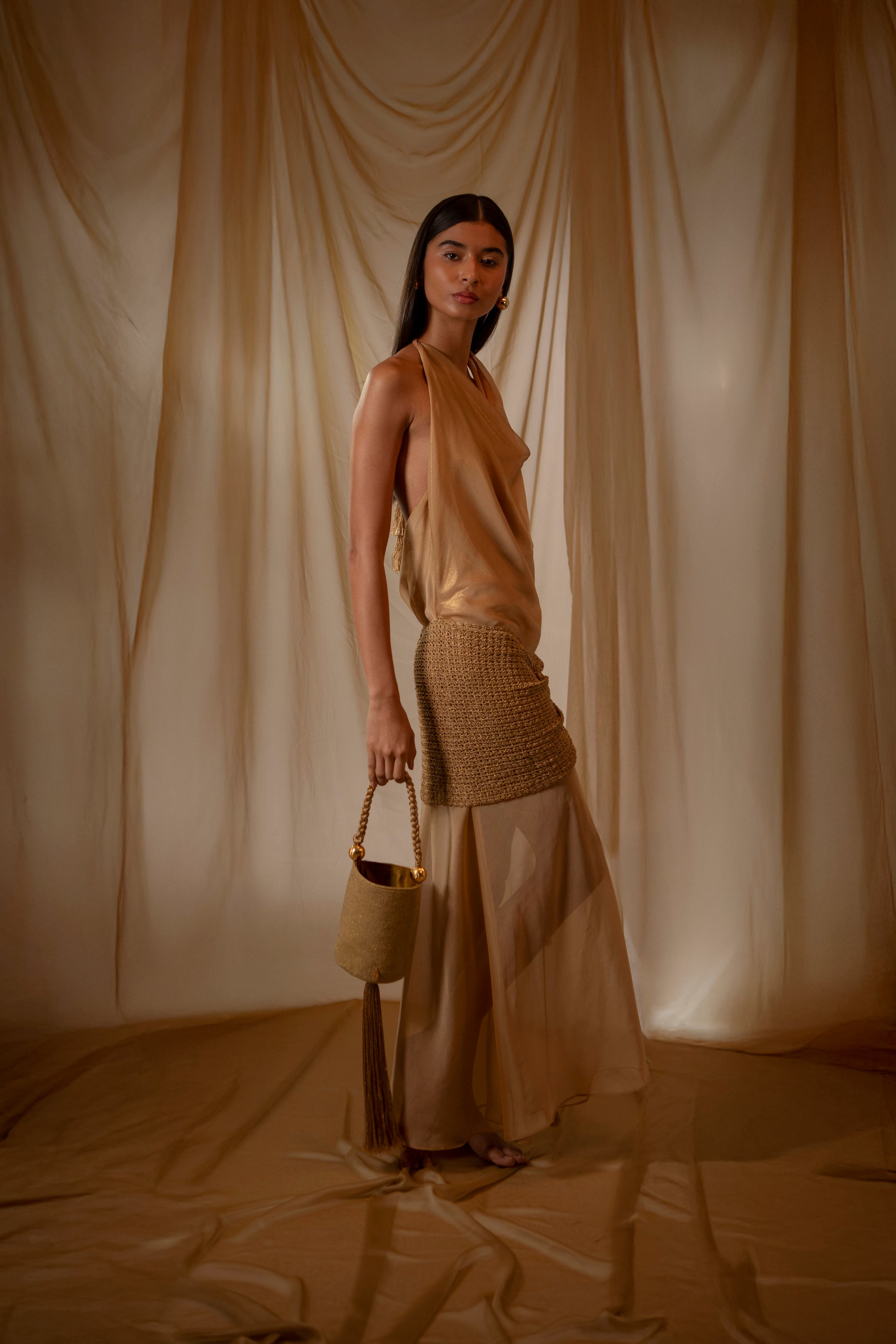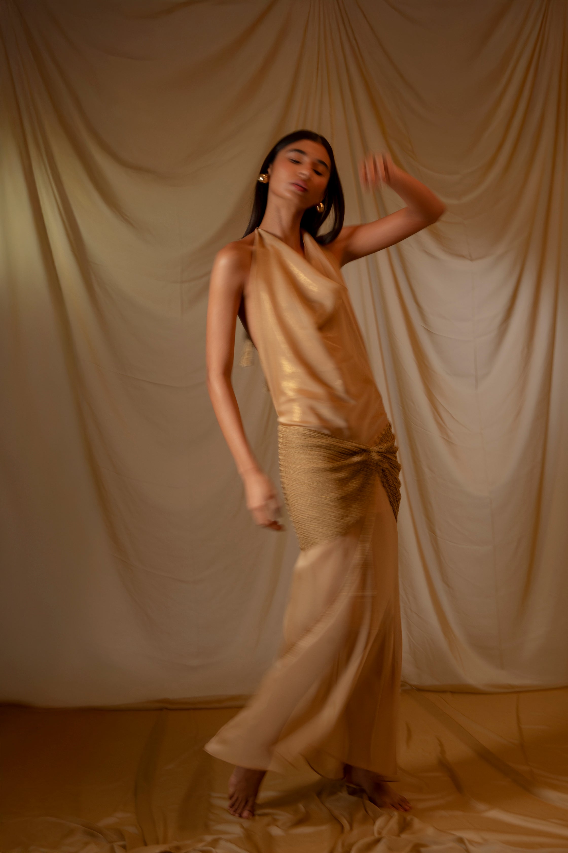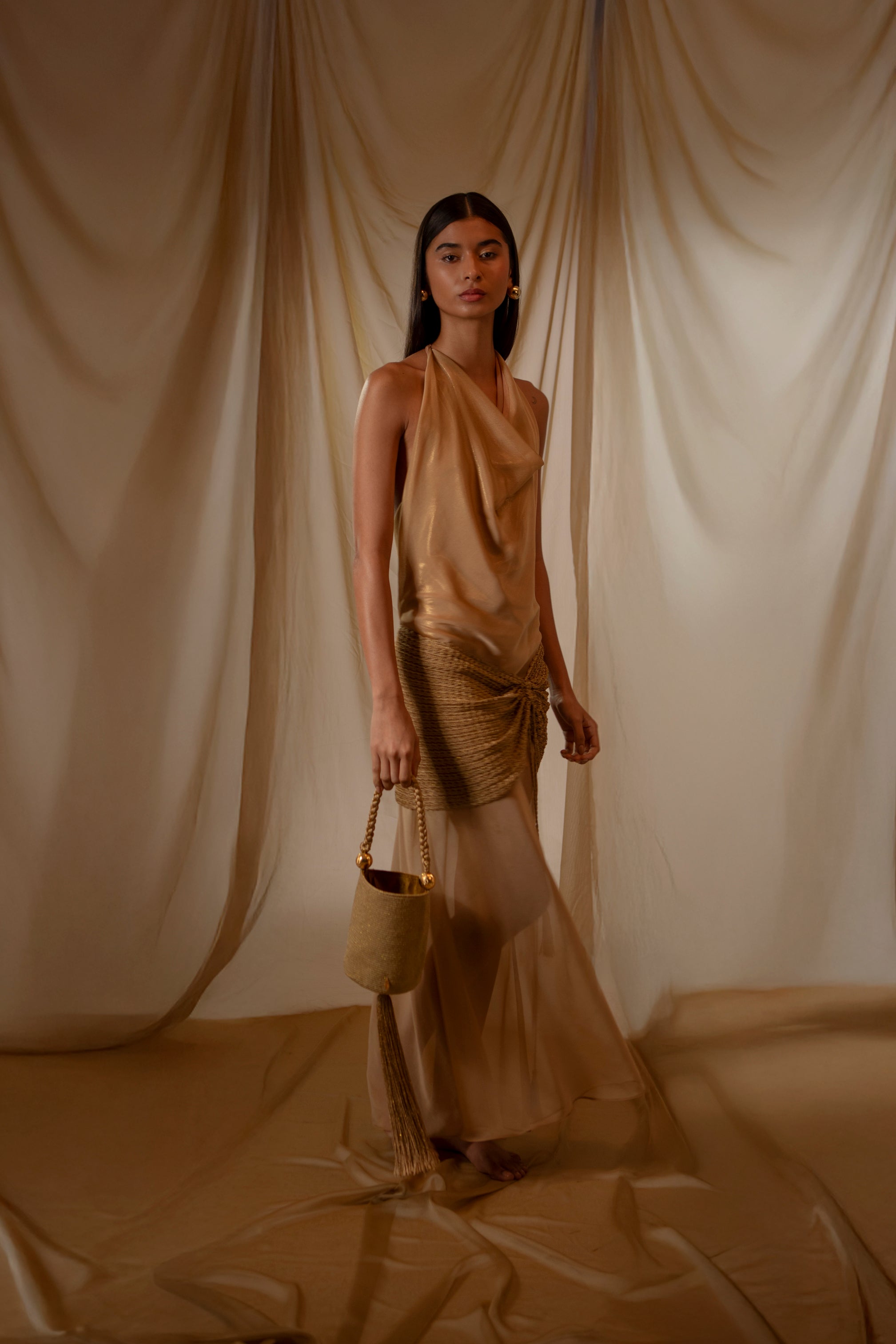 a subtle gather and adding texture. The skirt is straight with a light drape.