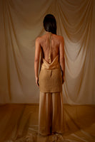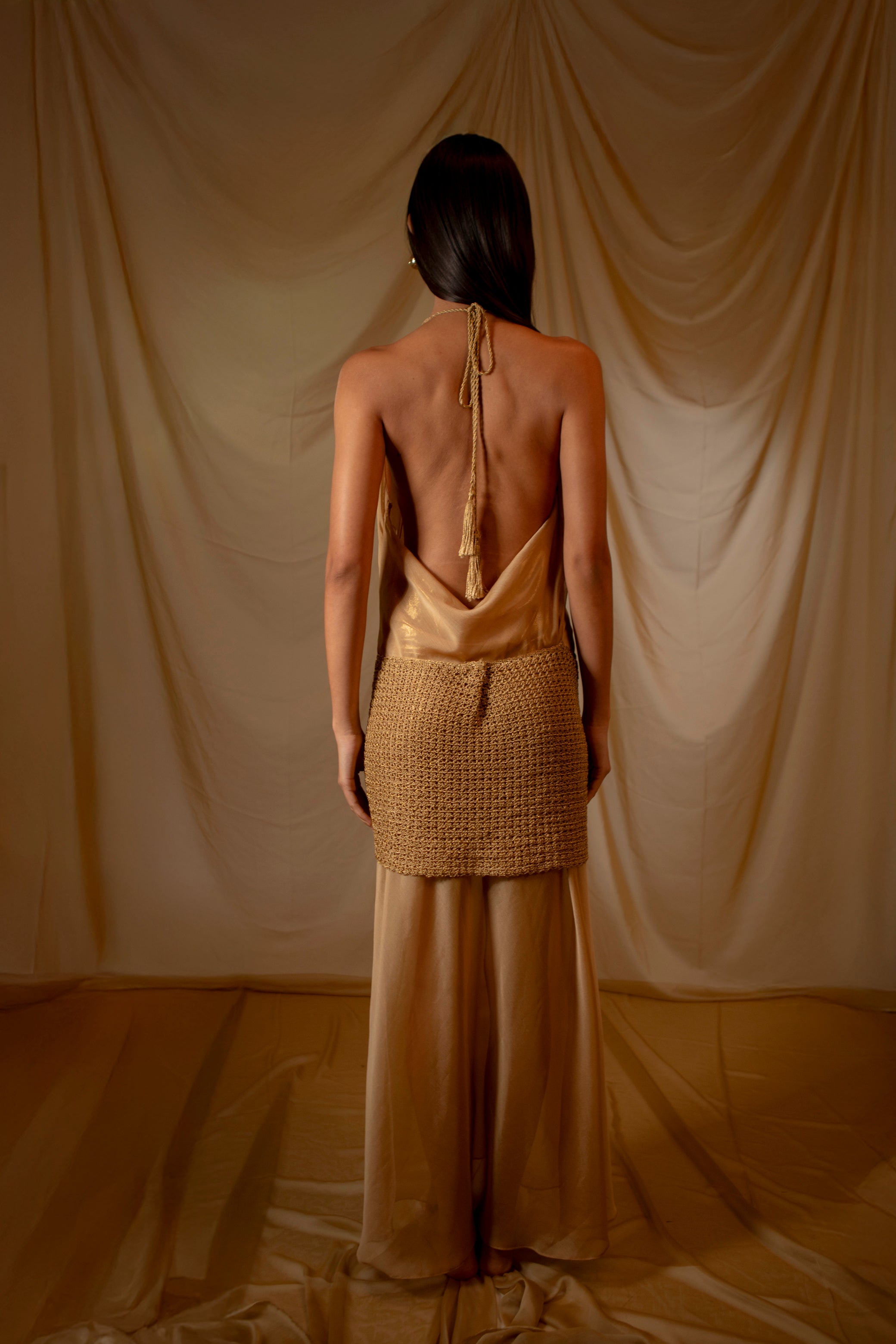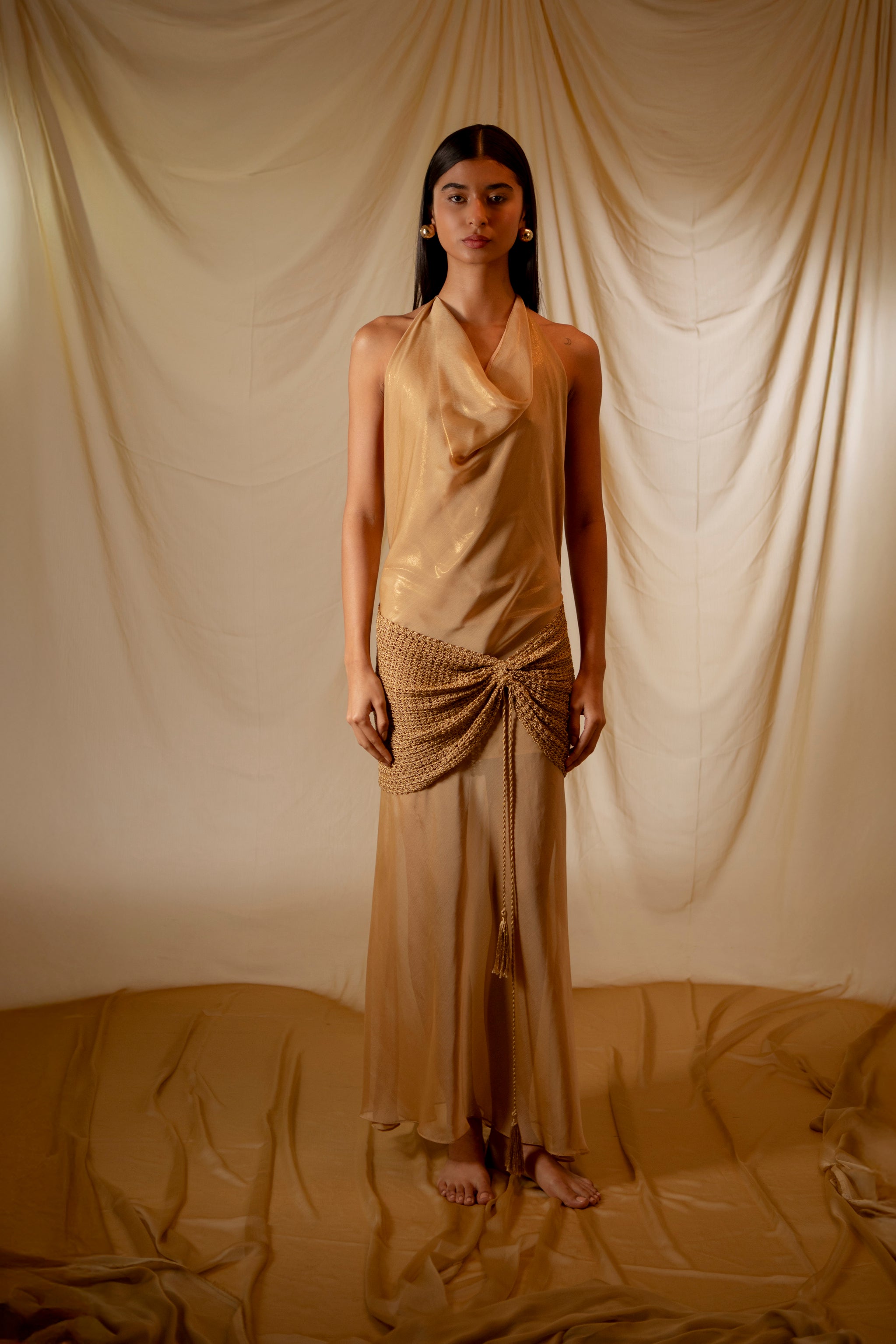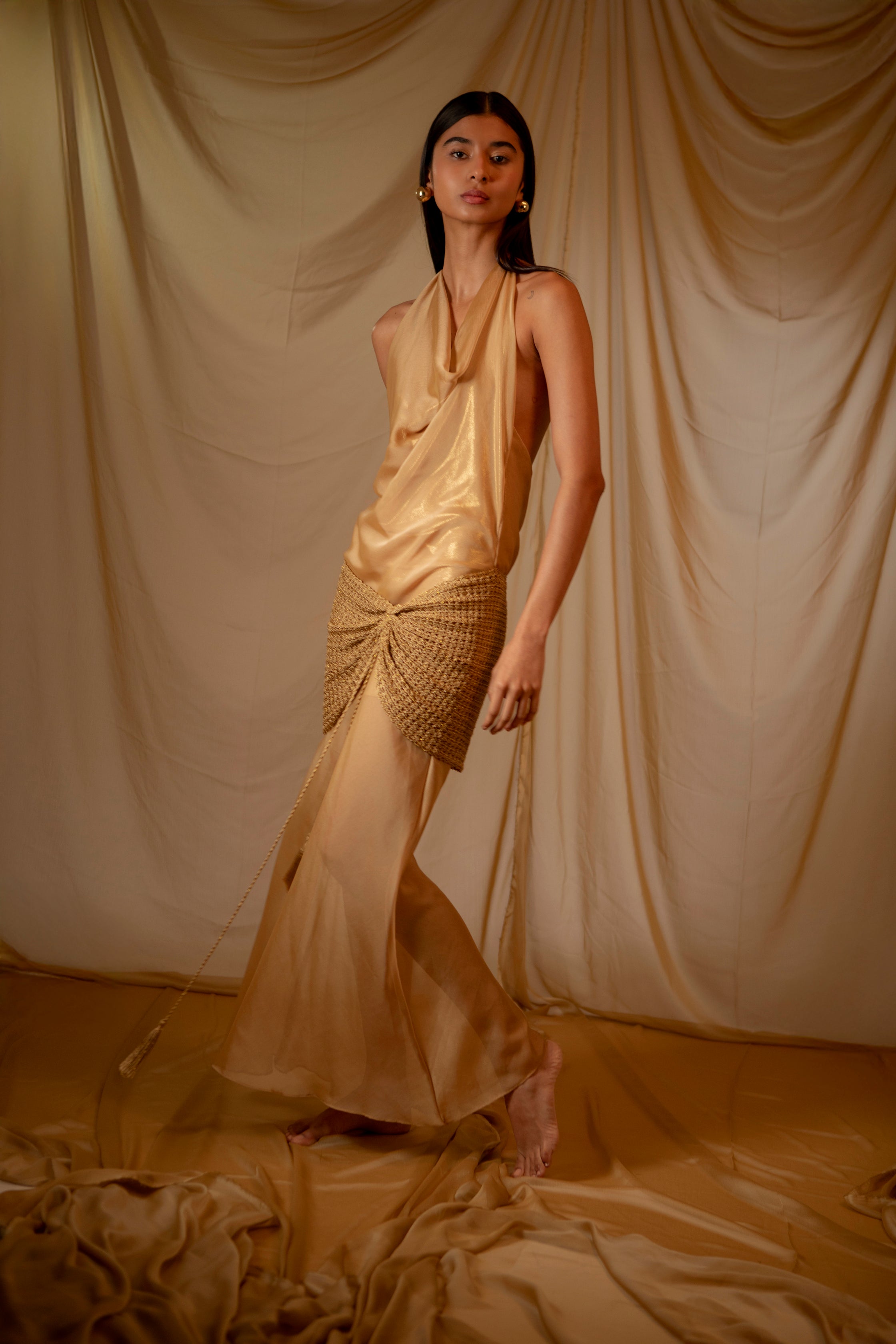 a subtle gather and adding texture. The skirt is straight with a light drape.